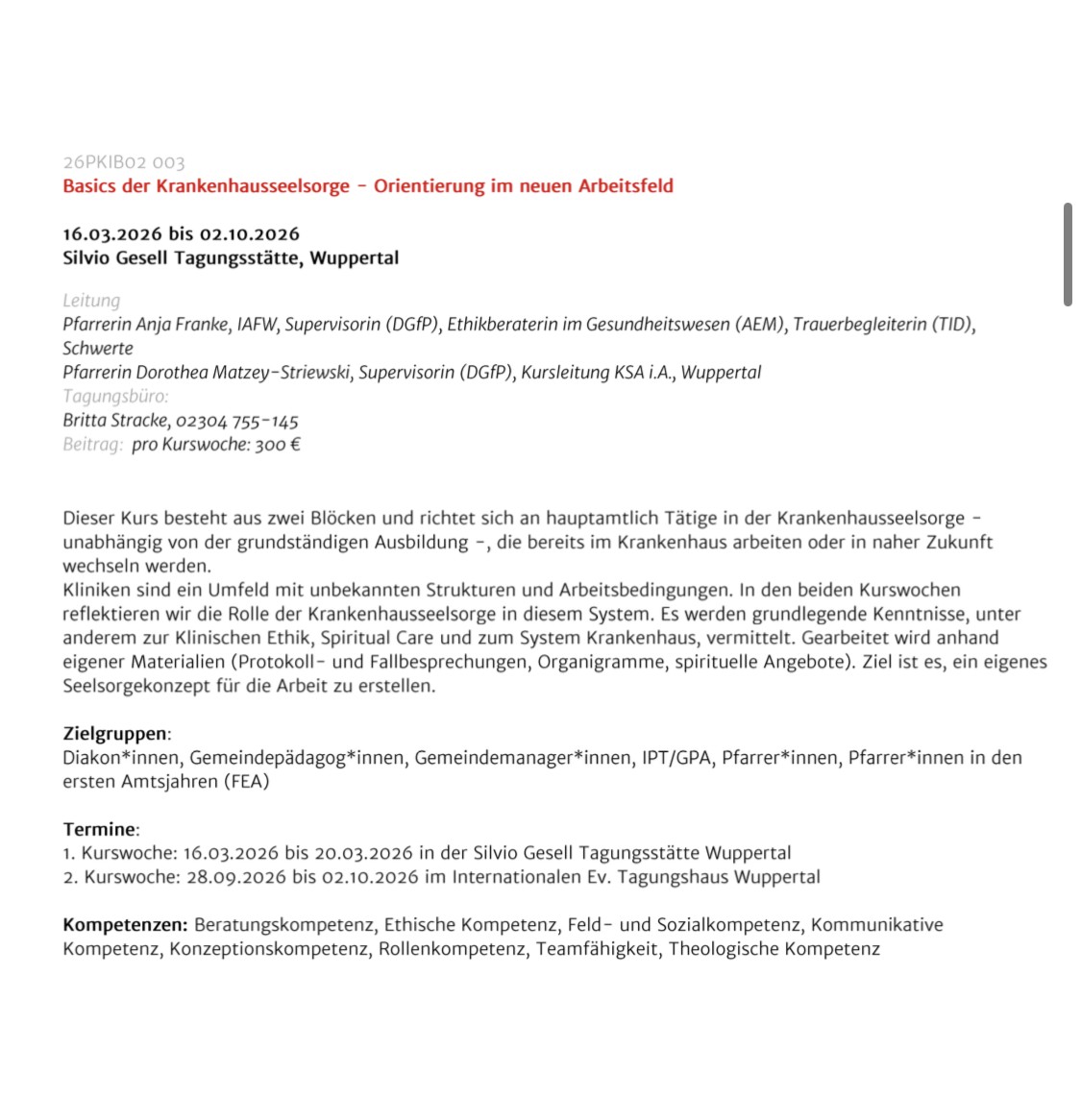 Dieser Kurs besteht aus zwei Blöcken und richtet sich an Hauptamtliche in der Krankenhausseelsorge - unabhängig von der grundständigen Ausbildung - die bereits im Krankenhaus abeiten oder in naher Zukunft wechseln werden.